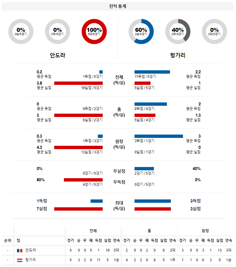 3. 헝가리 최근 원정 성적 : 5전 4승 1무 (무실점 비율 : 80%, 무득점 비율 : 20%)