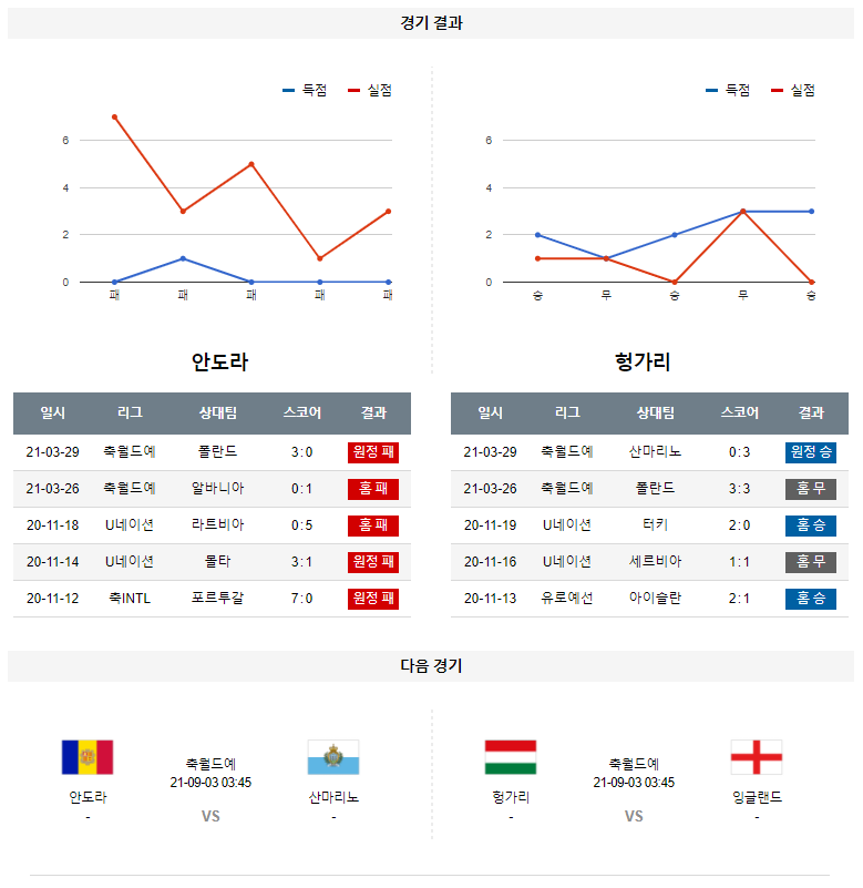 지난 산마리노 원정에서 3-0 승리를 거뒀다. 오르반(CB)을 중심으로 안정적인 3백 라인을 구축하고 있고, 아틸라 스잘라이(CB) 같은 어린 선수들도 꾸준히 스타팅 라인업에 포함되며 갈수록 성장하는 모습을 보이고 있다. 안도라 역시 산마리노처럼 유럽 최약체로 꼽히는 팀이고, 이번 경기에서도 어김없이 클린 시트를 달성할 가능성이 높다.