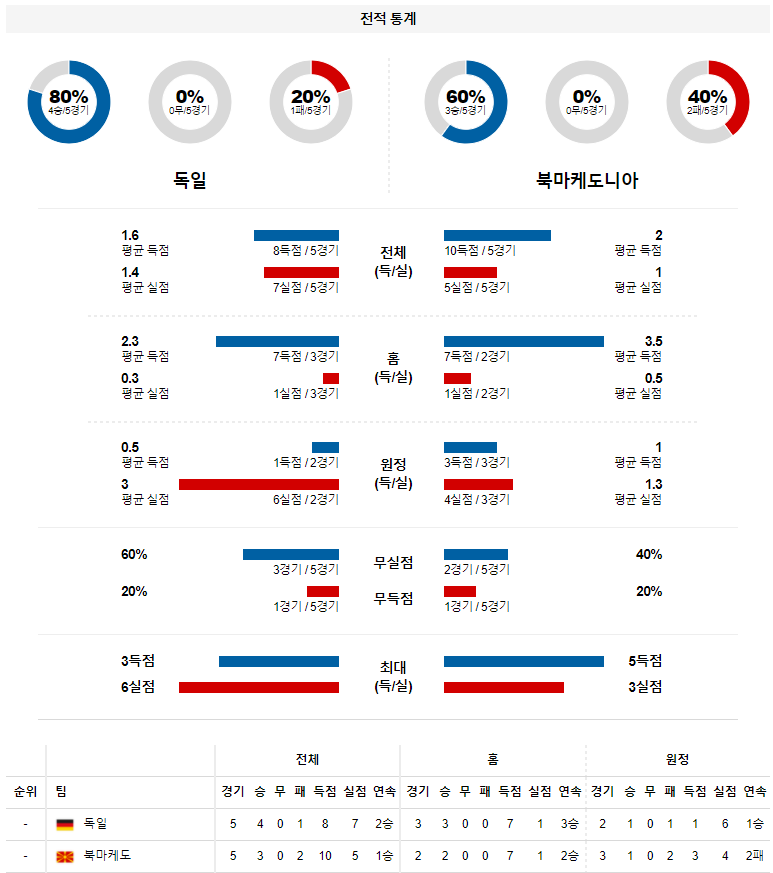 2. 독일 예선 경기 홈 성적 : 1전 1승 0무 0패 (무실점 비율 : 100%, 무득점 비율 : 0%)