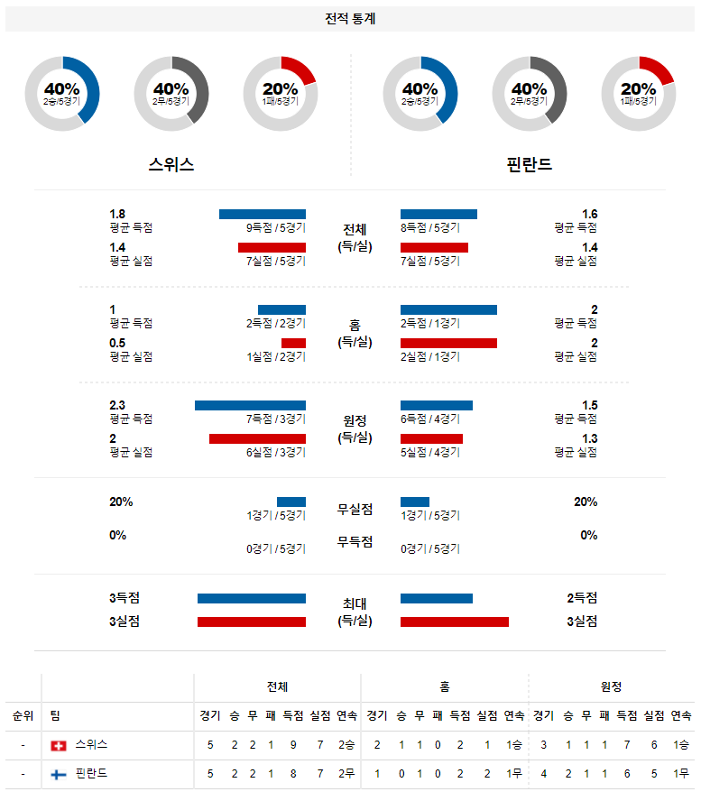 2. 스위스 최근 홈 성적 : 5전 2승 2무 1패 (무실점 비율 : 40%, 무득점 비율 : 0%)