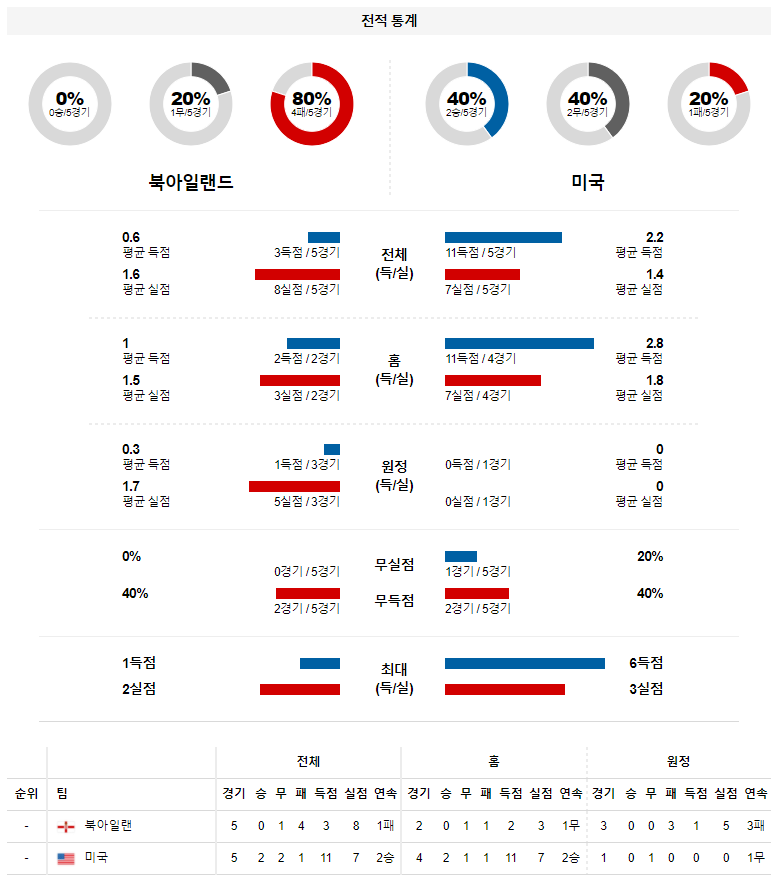2. 북아일랜드 최근 홈 성적 : 4전 1무 3패 (무실점 비율 : 0%, 무득점 비율 : 25%)