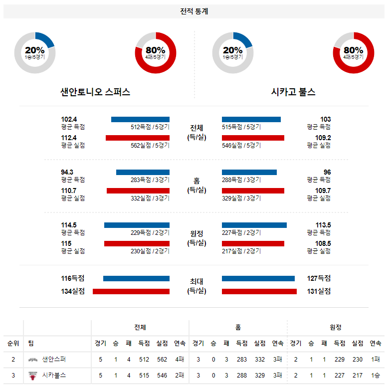 지난 클리퍼스 전에서 85-98 패배를 당했다. 하지만 더마 드로잔이 23득점을 올리며 다시 경기력을 회복한 점은 긍정적인 부분이다. 하지만 디죤테 머레이와 야곱 퍼들이 최근 고전을 면치 못하고 있다. 두 선수 모두 직전 경기에서 20득점에 성공하지 못했다. 드로잔에 대한 의존도가 더욱 높아질 수밖에 없다. 게다가 시카고는 트레이드를 통해 전력을 확실하게 강화한 상태다. 또다시 열세에 몰릴 가능성이 높다.