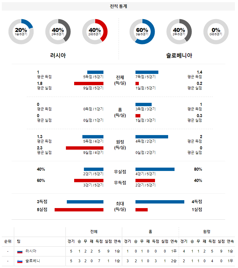 3. 슬로베니아 최근 원정 성적 : 4전 2승 1무 1패 (무실점 비율 : 75%, 무득점 비율 : 25%)