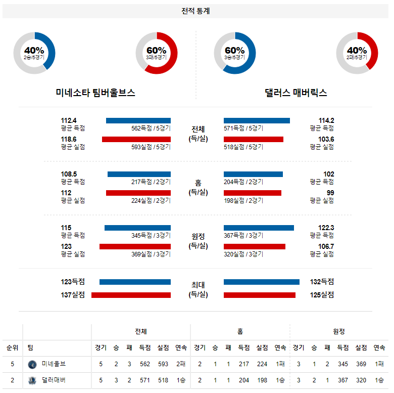 미네소타는 작정하고 탱킹을 노리는 오클라호마시티에게도 패할 정도로 공수 밸런스가 완전히 무너진 상태다. 계속해서 타운스에게만 의존하는 단순한 모습을 보인다면 더욱 나락으로 떨어질 가능성이 높다. 반면 댈러스는 주전 선수들이 꾸준하게 맹활약을 펼치고 있다. 댈러스가 승리할 전망이다.