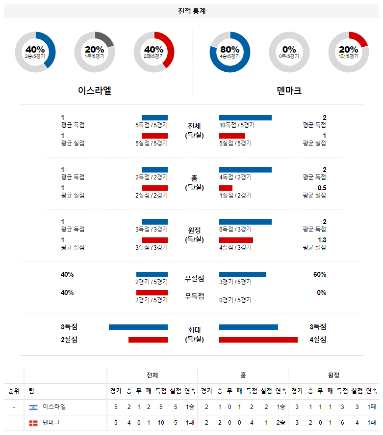 2. 이스라엘 최근 홈 성적 : 5전 2승 1무 2패 (무실점 비율 : 20%, 무득점 비율 : 0%)
