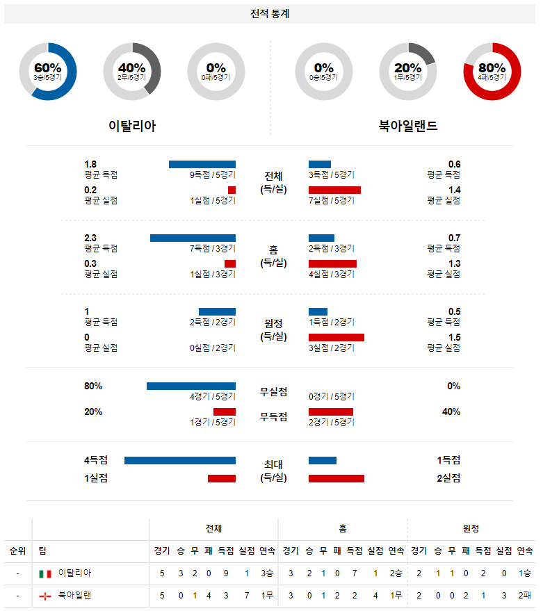 3. 북아일랜드 최근 원정 성적 : 5전 2무 3패 (무실점 비율 : 20%, 무득점 비율 : 40%)