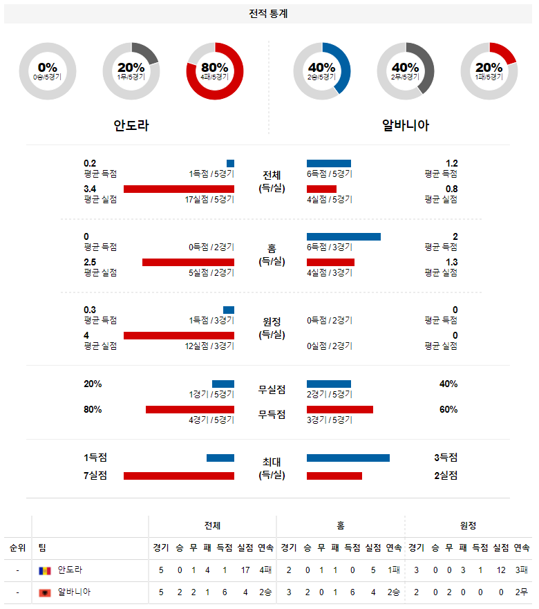 2. 안도라 최근 홈 성적 : 5전 1무 4패 (무실점 비율 : 20%, 무득점 비율 : 80%)