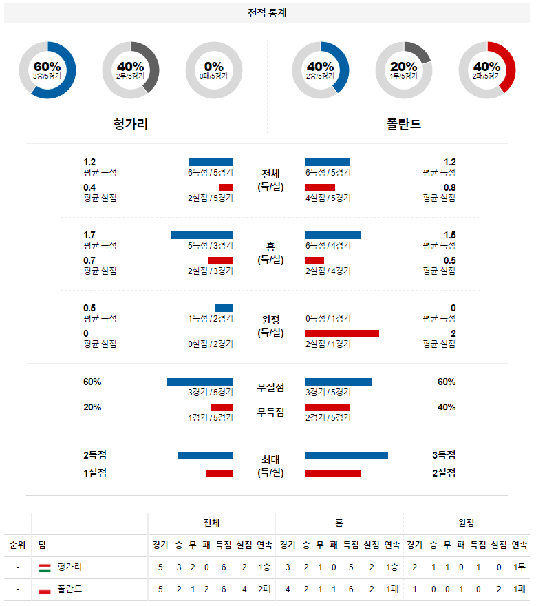 2. 헝가리 최근 홈 성적 : 5전 2승 1무 2패 (무실점 비율 : 20%, 무득점 비율 : 0%)