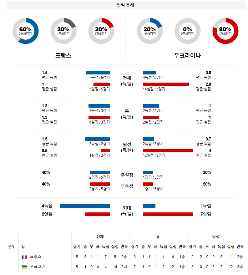 2. 프랑스 최근 홈 성적 : 6전 4승 1무 1패 (무실점 비율 : 17%, 무득점 비율 : 33%)