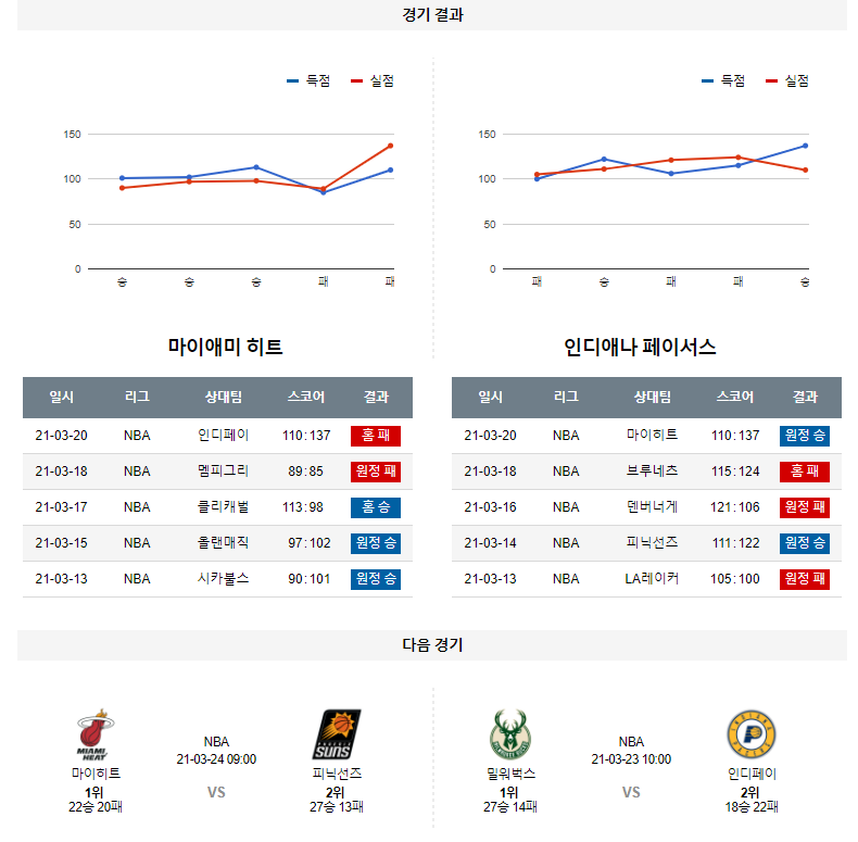 하루 휴식후 같은 장소에서 펼쳐지는 리턴매치 경기다. 20일 경기에서 패배가 마이애미에게 좋은 약이 되어줄 것이며 인디애나는 다음날 밀워키 원정 백투백 일정을 위해서 힘을 분산해야 한다. 마이애미 승리 가능성을 추천 한다.