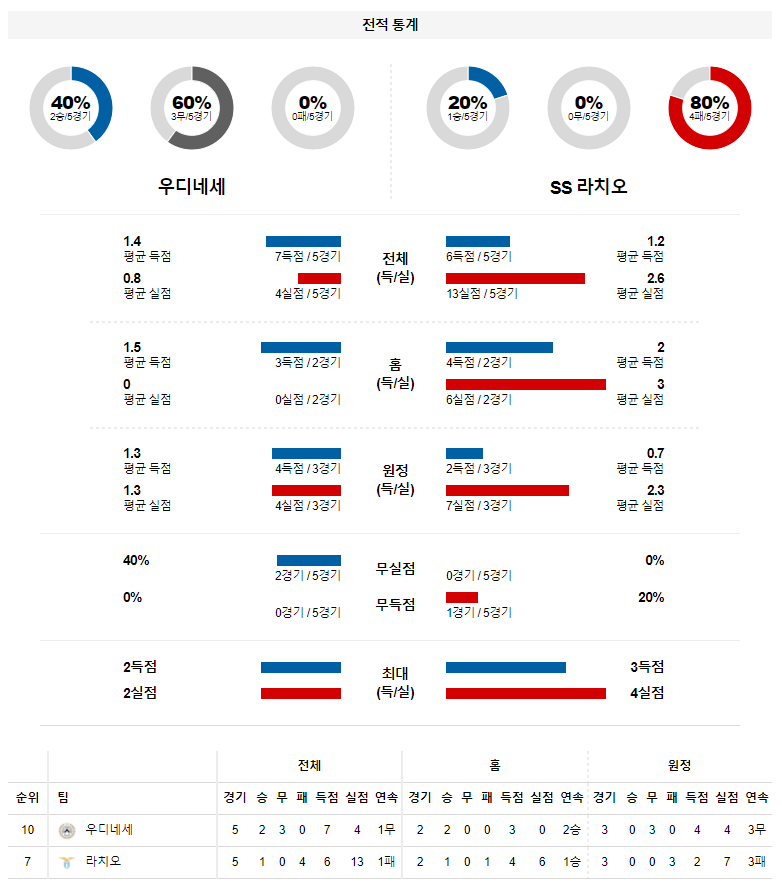 2. 우디네세 이번 시즌 홈 성적 : 13전 5승 3무 5패 (무실점 비율 : 48%, 무득점 비율 : 38%)
