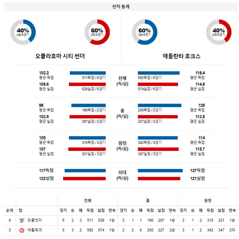 오클라호마가 최근 3경기 2승1패의 나쁘지 않은 페이스를 보이고 있지만 상대가 정상적인 전력이 아니였다는 것을 기억해야 한다. 또한, 오클라호마는 다음날 홈에서 덴버를 연속경기 일정 속에 만나기 때문에 힘을 분산해야 한다. 객관적인 전력에서 우위에 있는 애틀란타 승리 가능성을 추천 한다.