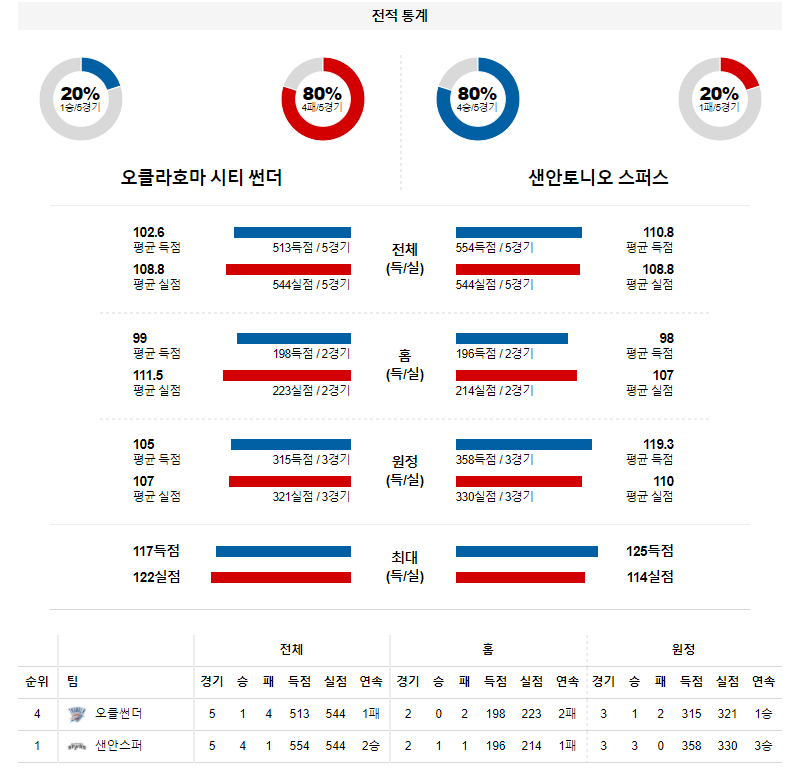 지난 마이애미 전에서 94-108 패배를 당했다. 샤이 길저스-알랙산더가 27득점을 기록하며 수준급의 득점력을 자랑했지만 휴식 차원에서 결장한 알 호포드의 공백을 메우지 못했다. 테오 말레돈, 켄리치 윌리엄스 같은 식스맨 자원들도 나쁘지 않은 득점력을 자랑했다. 그러나 역시 수비 코트 경쟁력이 현저하게 떨어지는 모습을 유지하고 있다. 이번 경기에서 호포드가 돌아온다고 하더라도 충분한 휴식 시간을 가지며 체력을 회복한 샌안토니오를 감당하지 못할 가능성이 높다.