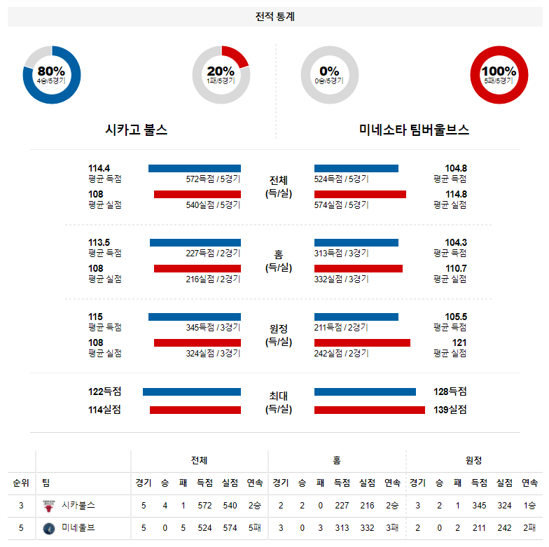 여전히 많은 문제점을 노출하고 있지만 칼 앤써니 타운스가 돌아오자 중위권 팀들을 상대로는 허무하게 무너지는 모습은 나타나지 않고 있다. 시카고의 수비가 강하지 않은 만큼 핸디캡 승부에서는 미네소타가 웃을수 있을 것으로 예상된다.