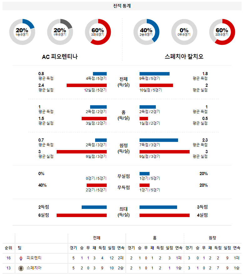 2. 피오렌티나 이번 시즌 홈 성적 : 11전 4승 4무 3패 (무실점 비율 : 27%, 무득점 비율 : 27%)