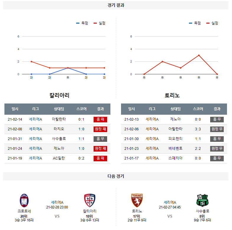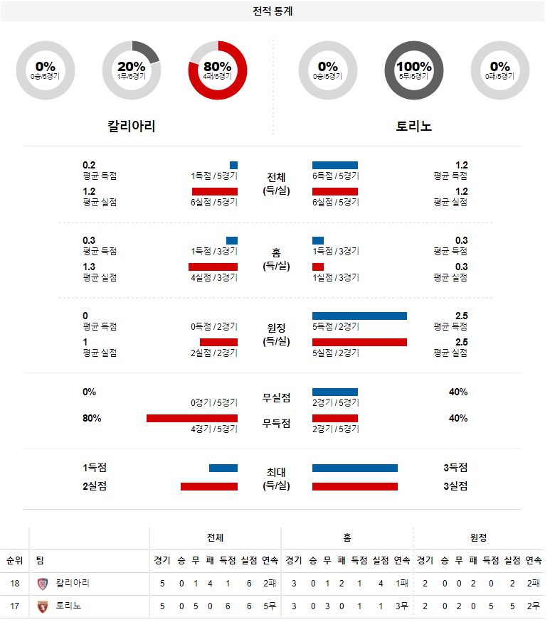 1. 최근 6경기 맞대결 : 6전 2승 3무 1패 9득점 10실점 (칼리아리 우세)