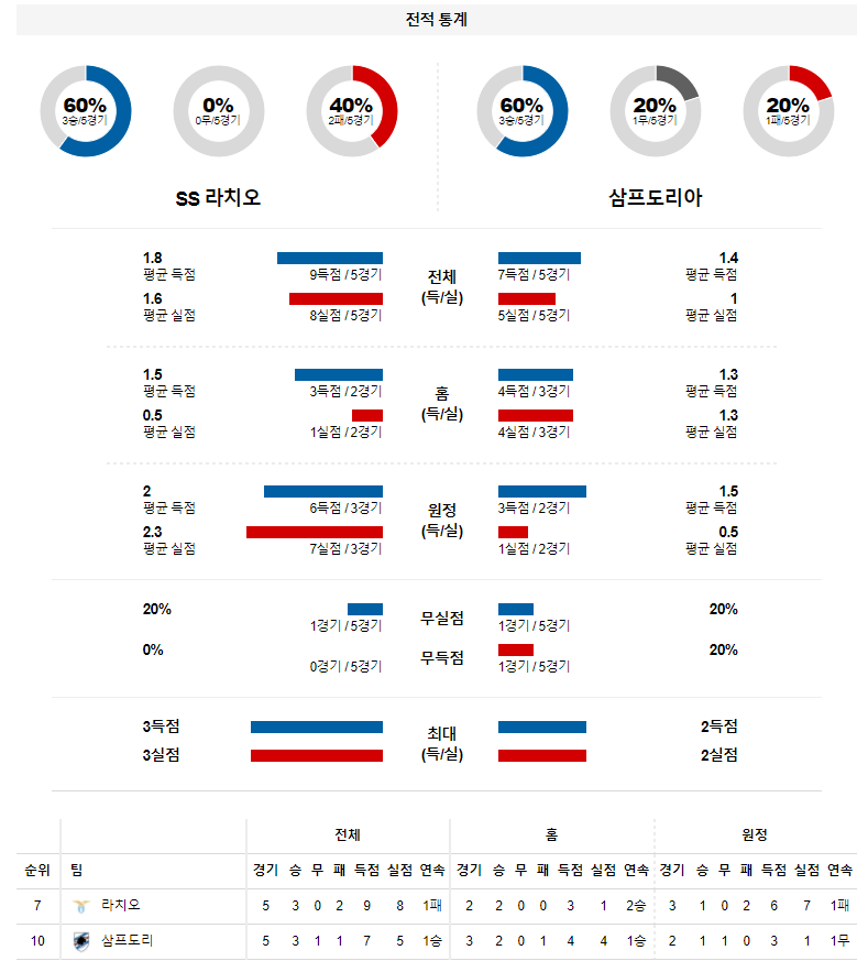 2. 라치오 이번 시즌 홈 성적 : 11전 6승 2무 3패 (무실점 비율 : 0%, 무득점 비율 : 50%)