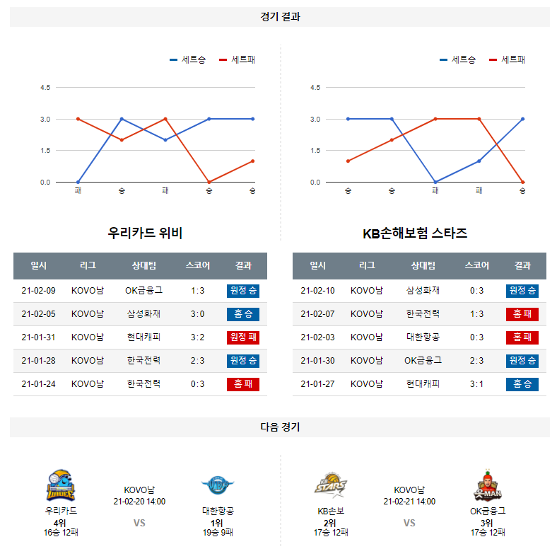 우리카드는 직전경기(2/9) 원정에서 OK금융그룹 상대로 3-1(23:25, 25:19, 25:16, 25:22) 승리를 기록했으며 이전경기(2/5) 홈에서 삼성화재 상대로 3-0(25:22, 25:17, 25:16) 승리를 기록했다. 2연승 흐름 속에 시즌 17승11패 성적. OK금융그룹 상대로는 알렉스(33득점, 69.05%)와 나경복(14득점, 56.52%)의 좌우 쌍포가 폭발한 경기. 알렉스와 나경복 이외에도 한성정(10득점, 66.67%)까지 적극적으로 공격에 가담하면서 이상적인 공격 점유율의 분배가 가능했고 세터 싸움에서 하승우 세터의 안정감이 돋보였던 상황. 또한, 또한, 하현용, 최석기가 10득점을 합작하며 중앙 싸움에서도 판정승을 기록했다는 것이 고무적 이였던 승리의 내용.