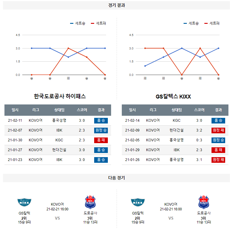 한국도로공사는 직전경기(2/11) 홈에서 흥국생명 상대로 3-0(25:16, 25:12, 25:14) 승리를 기록했으며 이전경기(2/7) 원정에서 IBK기업은행 상대로 3-2(25:21, 22:25, 23:25, 25:22, 15;5) 승리를 기록했다. 2연승+ 최근 6경기 5승1패 흐름 속에 시즌 11승13패 성적. 흥국생명 상대로는 리시브 효율성(60%)에서 IBK기업은행(14.91%) 보다 월등히 앞섰던 것이 완승을 기록할수 있는 힘이 되었던 경기. 리시브가 안정화 되자 켈시 페인(17득점, 44.44%)의 타점을 완벽하게 살랴주는 토스가 가능했고 배유나(15득점, 64.29%)를 이용한 중앙 속공을 자유자재로 사용할수 있었던 상황. 또한, 블로킹(13-4), 서브(7-1) 범실(14-20) 싸움에서 모두 완승을 기록했던 승리의 내용.