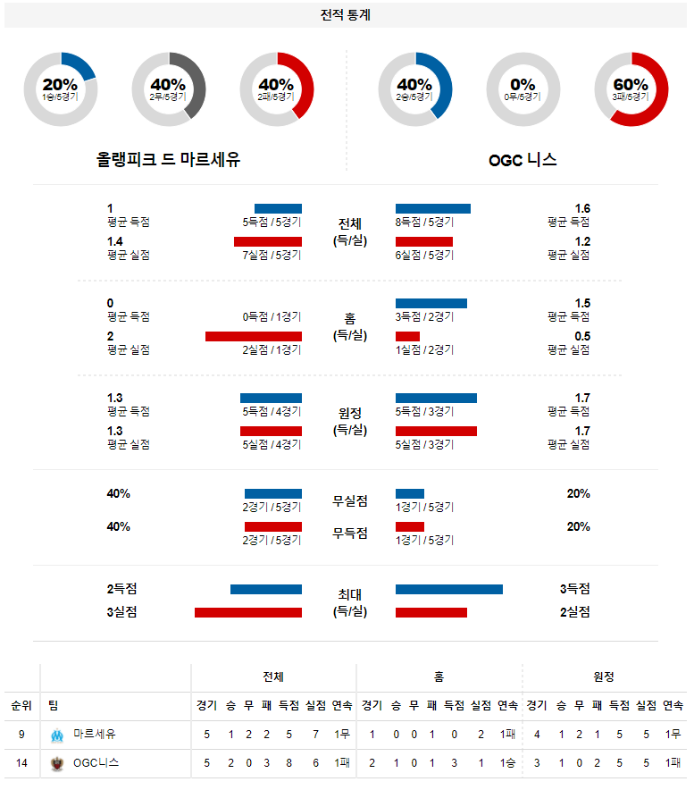 1. 최근 6경기 맞대결 : 6전 6승 12득점 5실점 (마르세유 우세)