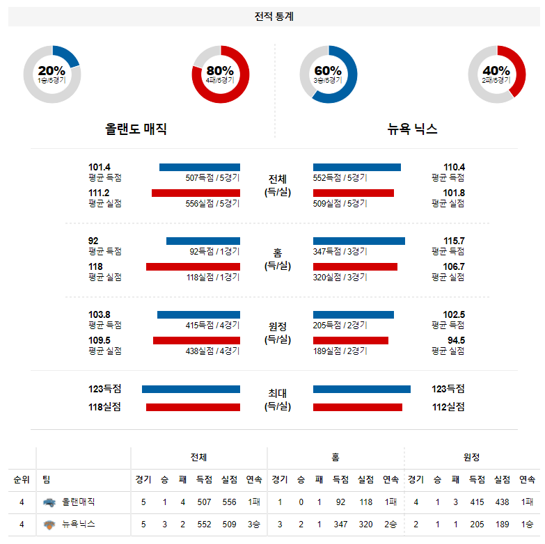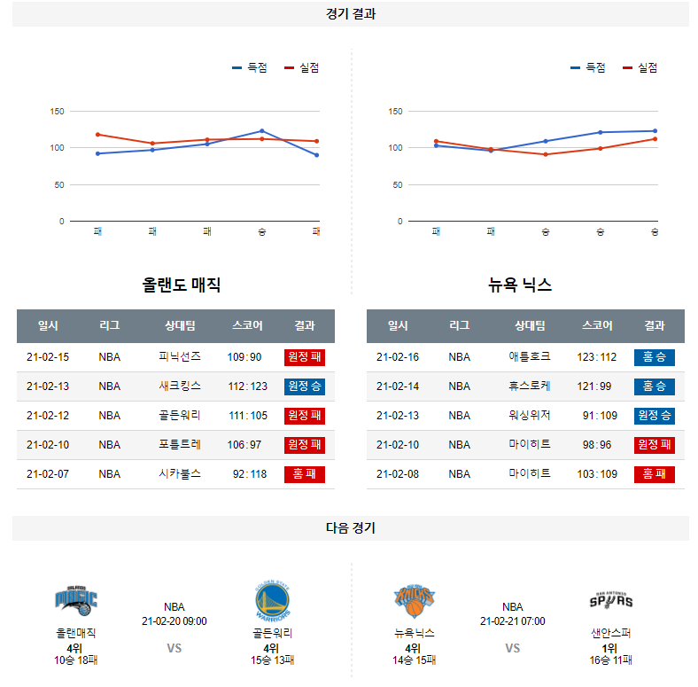 언더&오버 =>언더부상자가 너무 많은 올랜도는 니콜라 부세비치에 대한 의존도가 너무 커진 상황이다. 뉴욕은 니콜라 부세비치의 위력을 반감 시킬수 있는 높이와 수비력이 있다. 또한, 데릭 로즈를 트레이트를 통해서 영입한 효과가 선발과 벤치의 생산성이 모두 좋아진 모습으로 나타나고 있다. 뉴욕 승리 가능성을 추천 한다.