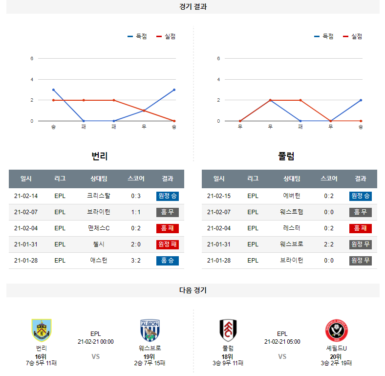 1. 최근 6경기 맞대결 : 6전 4승 2패 13득점 11실점 (번리 우세)