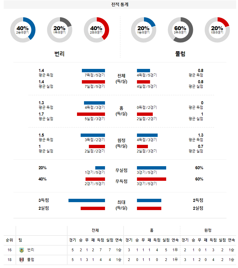2. 번리 이번 시즌 홈 성적 : 11전 4승 2무 5패 (무실점 비율 : 18%, 무득점 비율 : 45%)
