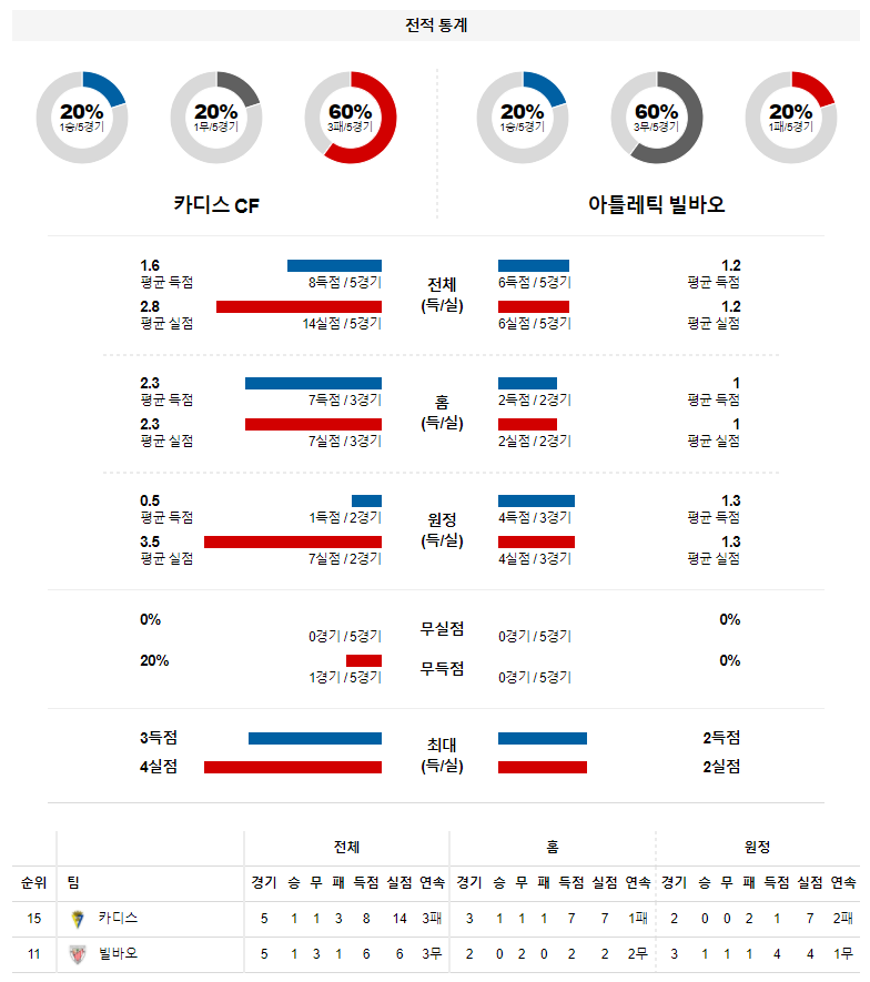 2. 카디스 올 시즌 홈 성적 : 11전 2승 4무 5패 (무실점 비율 : 18%, 무득점 비율 : 45%)