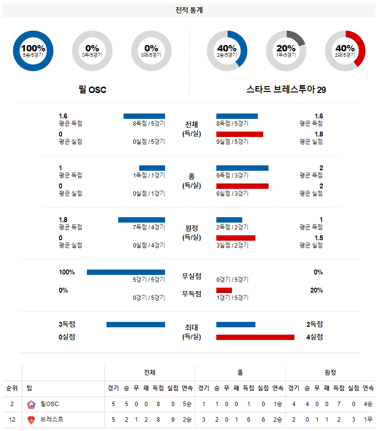 2. 릴 올 시즌 홈 성적 : 12전 8승 3무 1패 (무실점 비율 : 50%, 무득점 비율 : 8%)