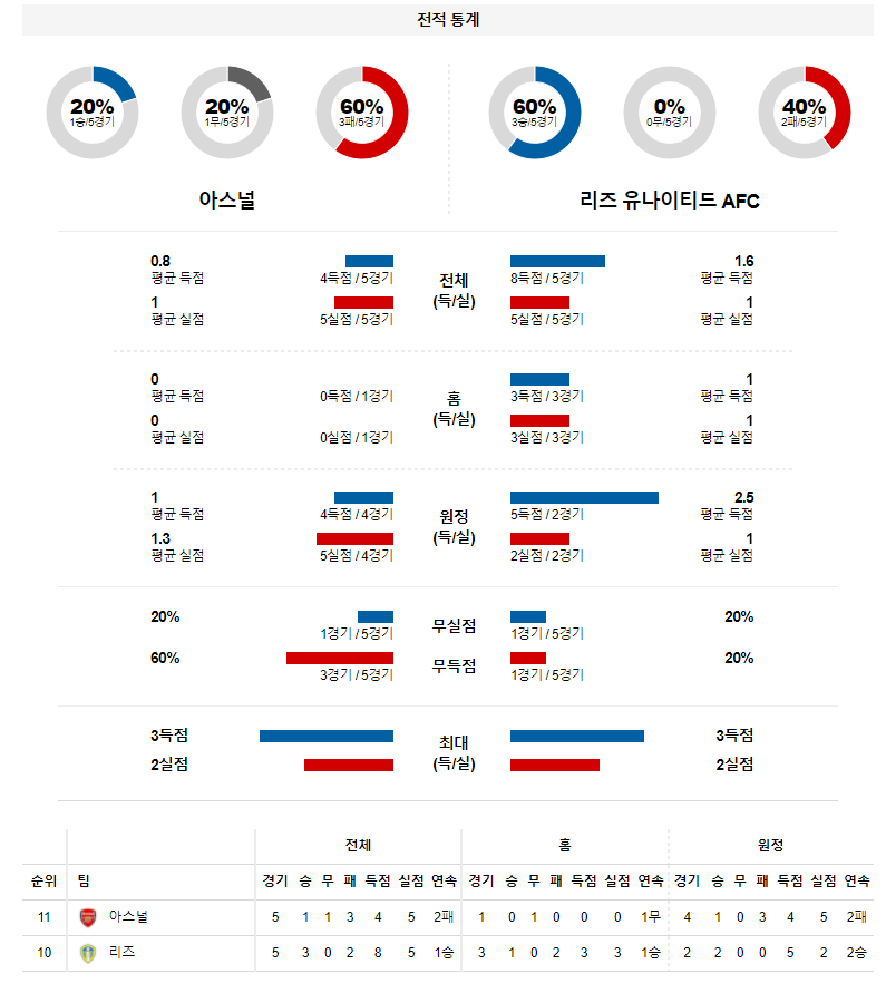 2. 아스널 이번 시즌 홈 성적 : 11전 4승 3무 4패 (무실점 비율 : 27%, 무득점 비율 : 45%)