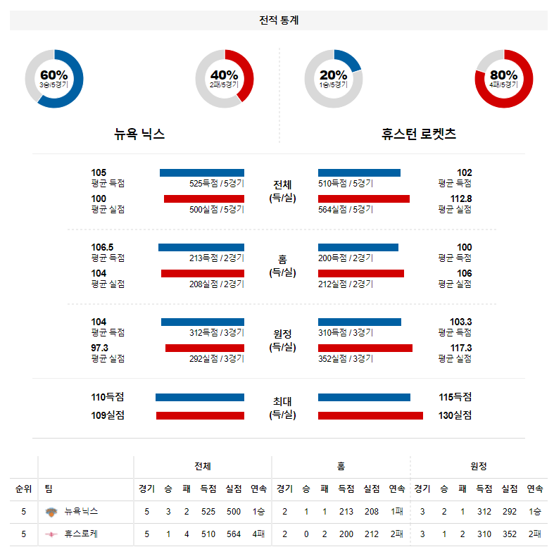 연속경기 일정의 피로누적이 뉴욕에게 문제가 될것이다. 존 월이 림을 직접 공략하는 돌파 옵션의 비중을 높이면서 외곽에서도 많은 찬스를 만들어 낼수 있을 것이다. 휴스턴 승리 가능성을 추천 한다.