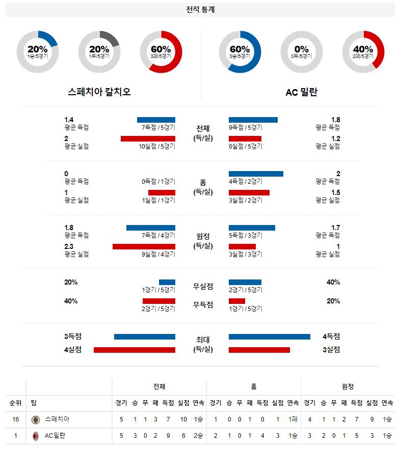 2. 스페지아 이번 시즌 홈 성적 : 10전 1승 3무 6패 (무실점 비율 : 10%, 무득점 비율 : 30%)