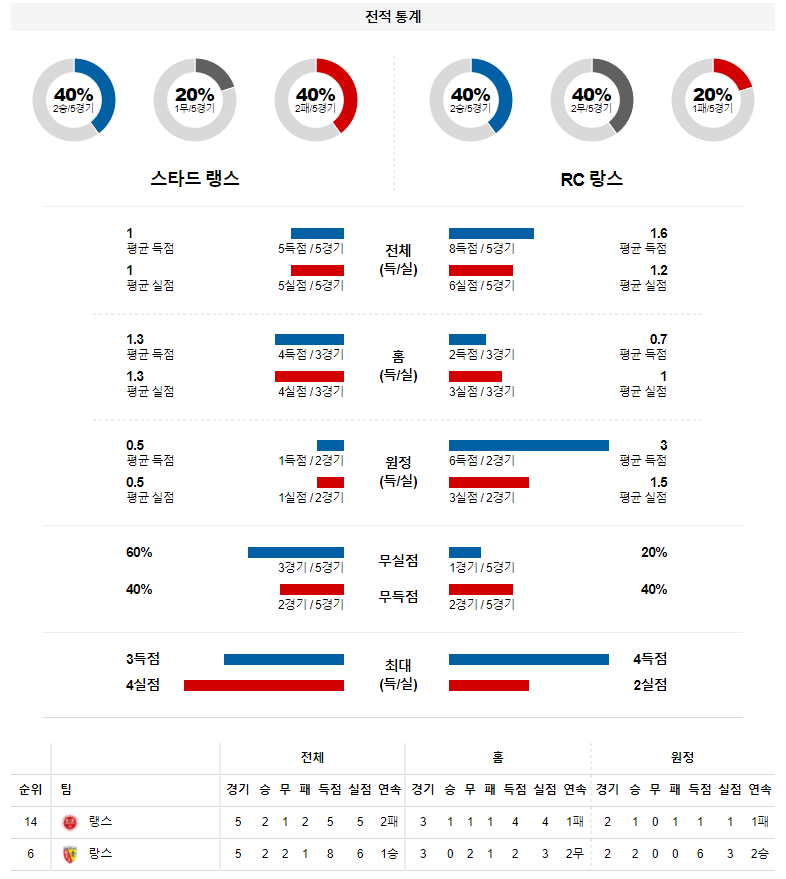3. 랑스 올 시즌 원정 성적 : 12전 6승 2무 4패 (무실점 비율 : 33%, 무득점 비율 : 17%)