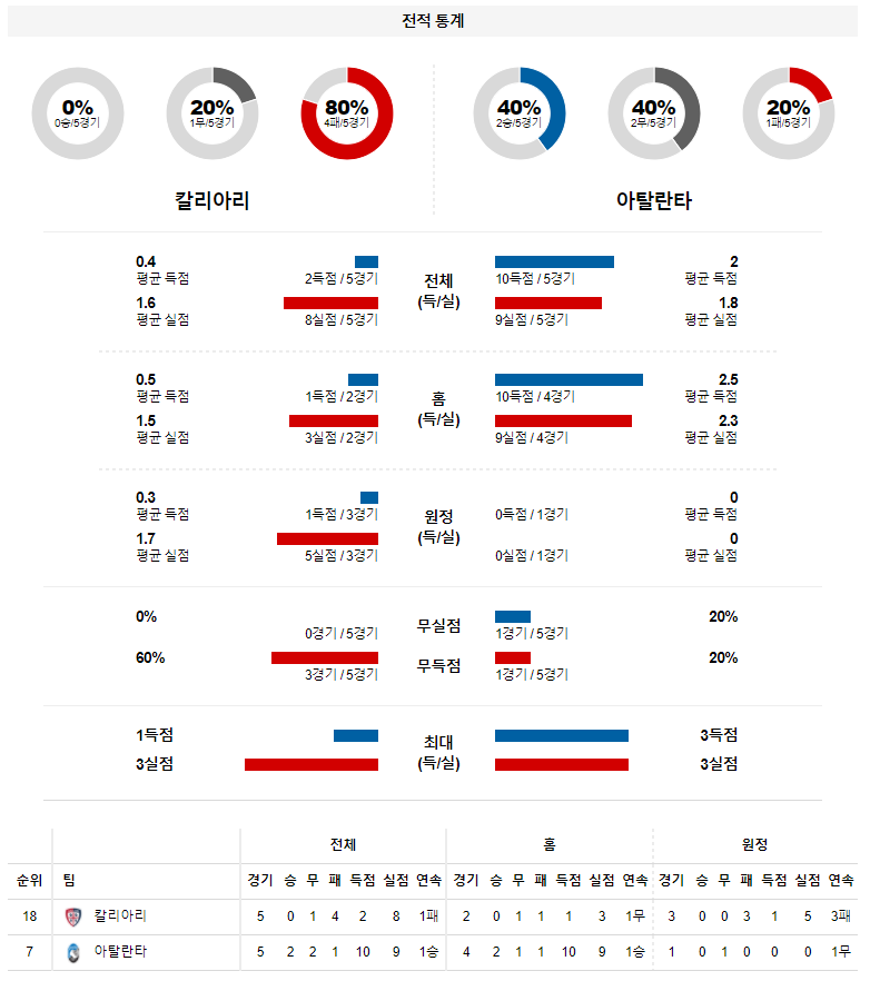 2. 칼리아리 이번 시즌 홈 성적 : 10전 2승 3무 5패 (무실점 비율 : 10%, 무득점 비율 : 20%)
