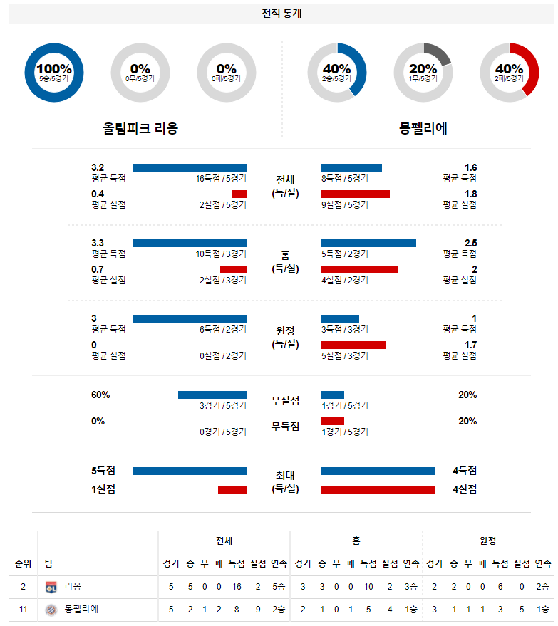 2. 리옹 올 시즌 홈 성적 : 12전 8승 3무 1패 (무실점 비율 : 33%, 무득점 비율 : 17%)