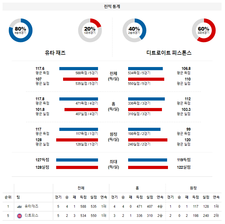 코트를 넓게 쓰면서 스페이싱이 빠르고 정교해진 유타가 수비 조직력이 붕괴 된 디트로이트를 상대로 소나기 3점슛을 성공시킬 것이다. 유타 승리 가능성을 추천 한다.