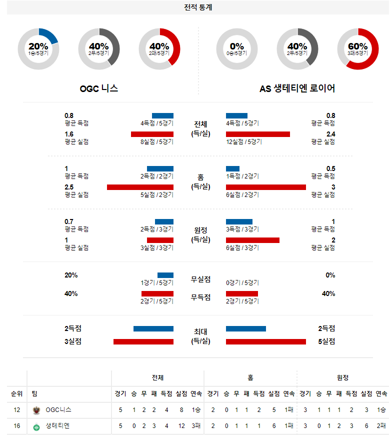 2. 니스 올 시즌 홈 성적 : 10전 2승 2무 6패 (무실점 비율 : 0%, 무득점 비율 : 60%)