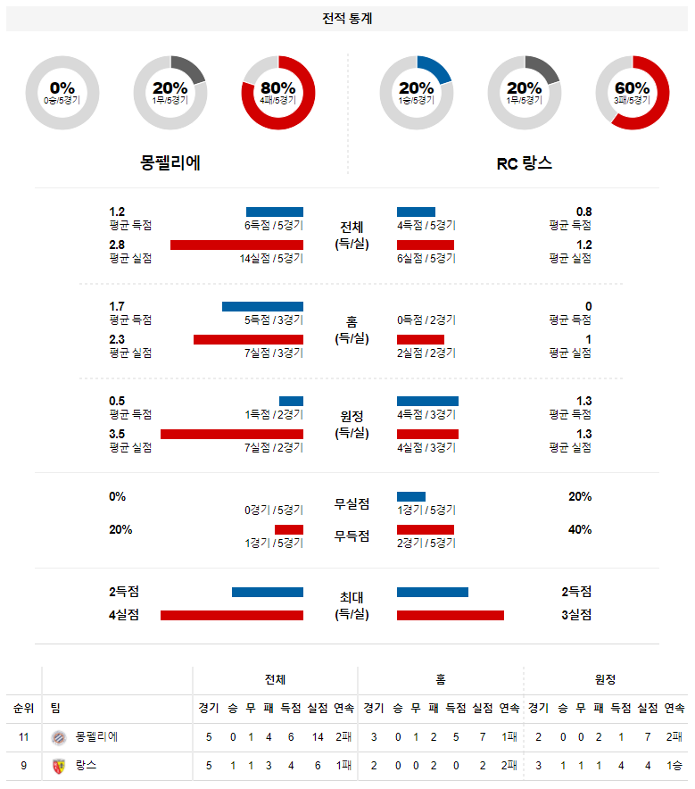 3. 랑스 올 시즌 원정 성적 : 11전 5승 2무 4패 (무실점 비율 : 36%, 무득점 비율 : 18%)