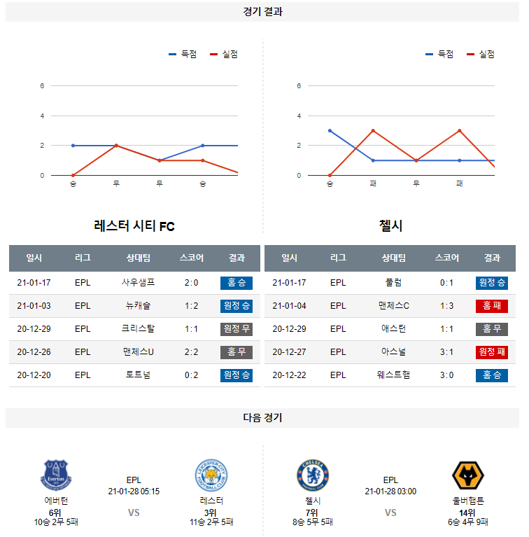 지난 풀럼 원정에서 1-0 승리를 거뒀다. 직전 경기에서는 클린 시트를 기록했지만 이전 3경기에서는 7실점을 내주며 수비 불안에 시달렸다. 게다가 중원 수비의 핵심인 캉테(CM)마저 경고 누적으로 인해 결장하는 최악의 상황이다. 실바(CB)와 주마(CB)로 구성된 센터백 듀오는 리그에서 가장 발이 느린 센터백 듀오라고 해도 과언이 아닐 정도다. 바디의 뒷공간 침투를 감당하지 못하며 대량 실점을 내줄 것이 유력하다.