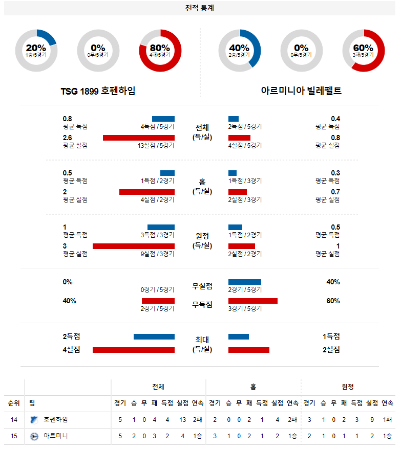 2. 호펜하임 이번 시즌 홈 성적 : 7전 3승 3무 1패 (무실점 비율 : 29%, 무득점 비율 : 0%)