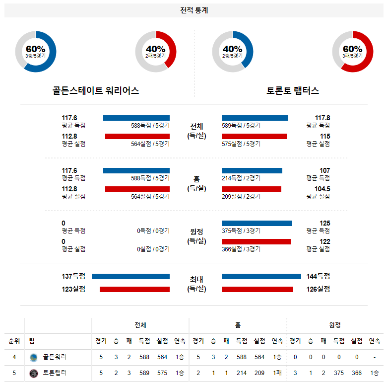 직전 경기에서 토론토가 반전에 성공했지만 올 시즌 시아캄과 밴블리트는 기복이 심한 모습을 보이고 있다. 반면 골든스테이트는 커리에 대한 의존도가 높지만 커리가 확실하게 마무리를 지어주고 있다. 골든스테이트가 승리할 전망이다.