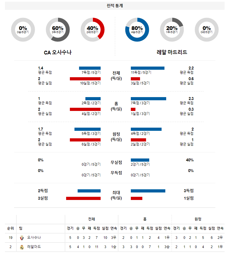 2. 오사수나 올 시즌 홈 성적 : 8전 2승 2무 4패 (무실점 비율 : 25%, 무득점 비율 : 13%)