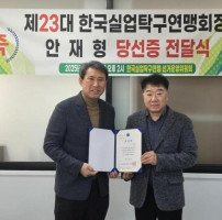 안재형 신임 한국실업탁구연맹 회장(왼쪽)이 당선증을 전달받고 있다. [사진=한국실업탁구연맹)안재형 제이앤에이 대표(전 대한항공 감독)가 제23대 한국실업탁구연맹 회장에 당선됐다.한국실업탁구연맹은 5일 "안 대표가 전날 열린 회장 선거에서 새로운 수장이 됐다"고 밝혔다.안 신임 연맹 회장은 1986 서울 아시안 게임 탁구 …