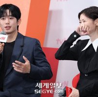 배우 정해인(사진 왼쪽)과 정소민이 14일 오전 서울 구로구 라마다 신도림 호텔에서 열린 tvN 새 토일드라마 '엄마친구아들' 제작발표회에 참석해 대화를 나누고 있다. 정해인, 정소민, 김지은, 윤지온가 출연하는 '엄마친구아들'은 오류 난 인생을 재부팅 하려는 여자와 그의 살아있는 흑역사인 '엄마친구아들'이 벌이는 로맨스…