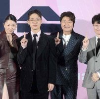 배우 장윤주, 박정민, 송강호, 신연식 감독(왼쪽부터)이 28일 CGV 용산점에서 열린 영화'1승(감독 신연식)' 제작발표회에서 포즈를 취하고 있다. 영화'1승(감독 신연식)'은 이겨본 적이 없는 감독과 이길 생각이 없는 구단주, 이기는 법을 모르는 선수들까지 승리의 가능성이 1도 없는 여자배구단이 1승을 위해 도전에 나…